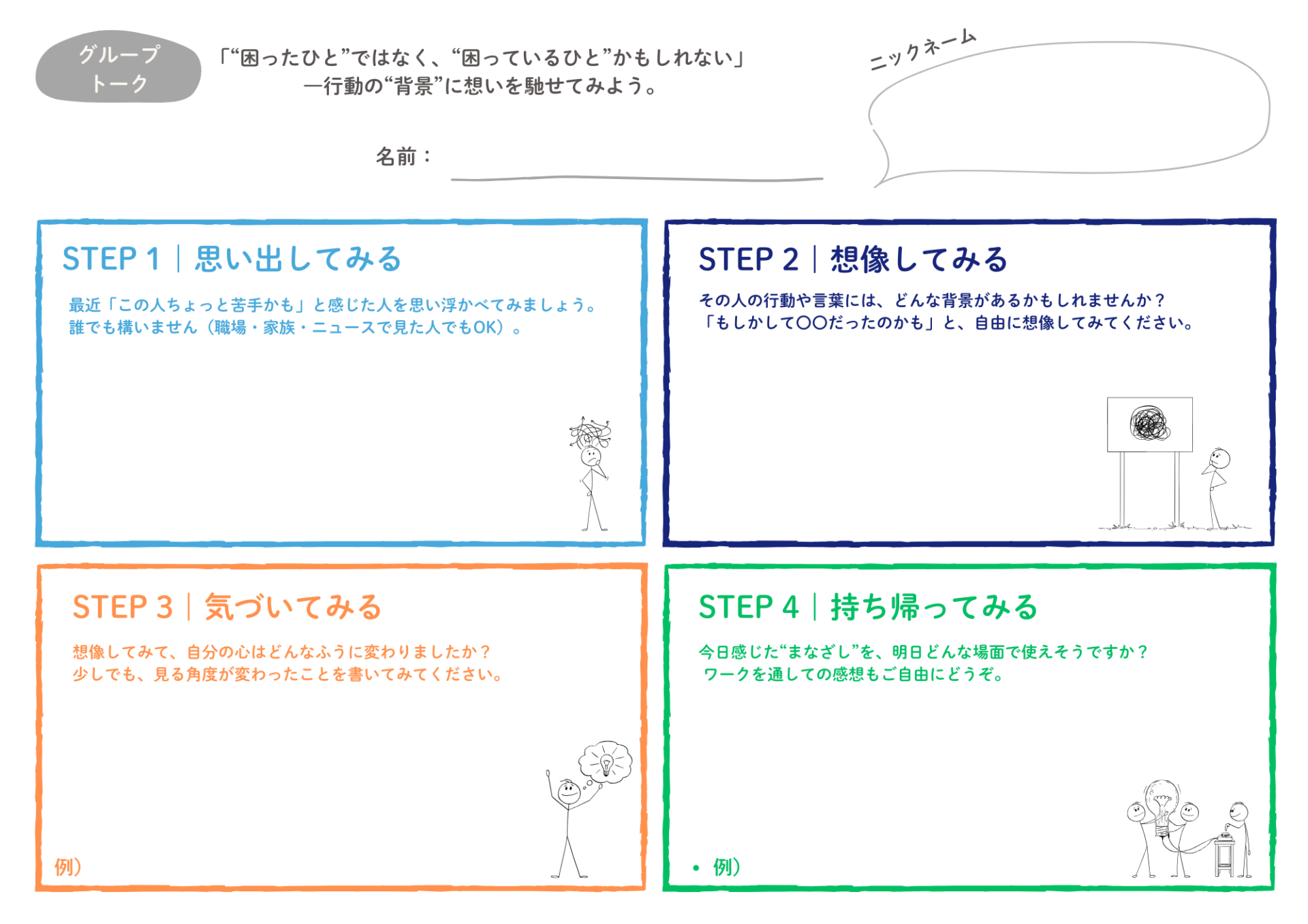 後半は、参加者全員でのグループトークの時間。テーマは 「行動の背景に思いを馳せてみよう」