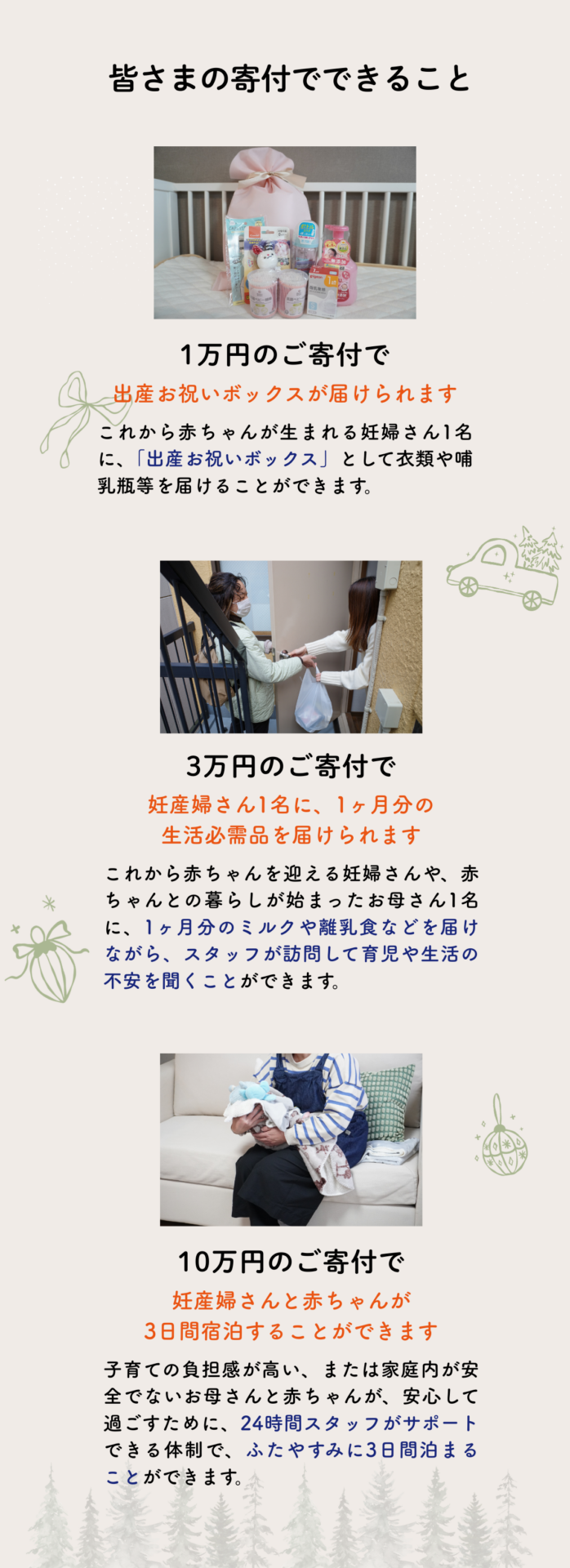 あなたの寄付が、「頼れる誰かがいる」という安心を届け、妊産婦さんと家族の生活、そして生まれてくる命を支えます。