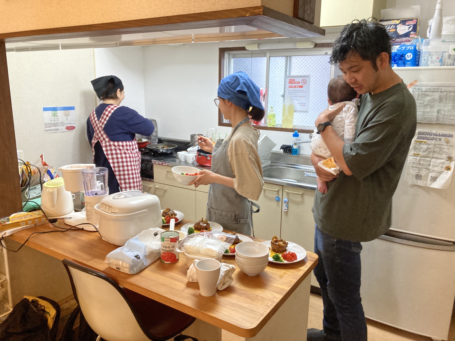 リビングには、他の家族の赤ちゃんやこどもがいて、お昼ご飯のハンバーグを皆で美味しそうに食べています。