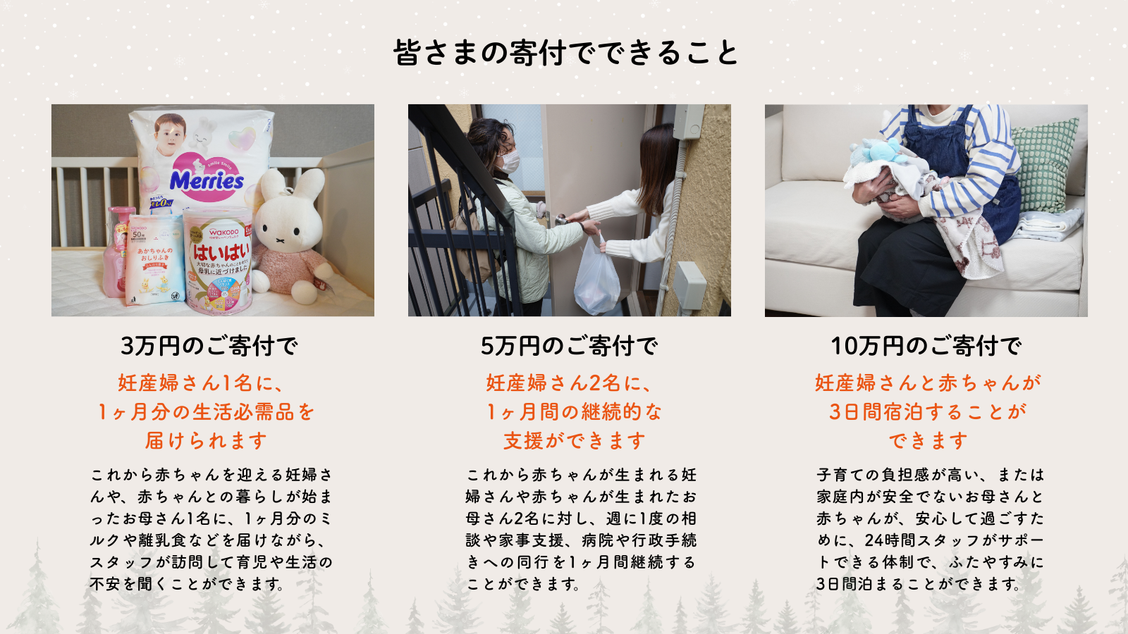 あなたの寄付が、「頼れる誰かがいる」という安心を届け、妊産婦さんと家族の生活、そして生まれてくる命を支えます。
