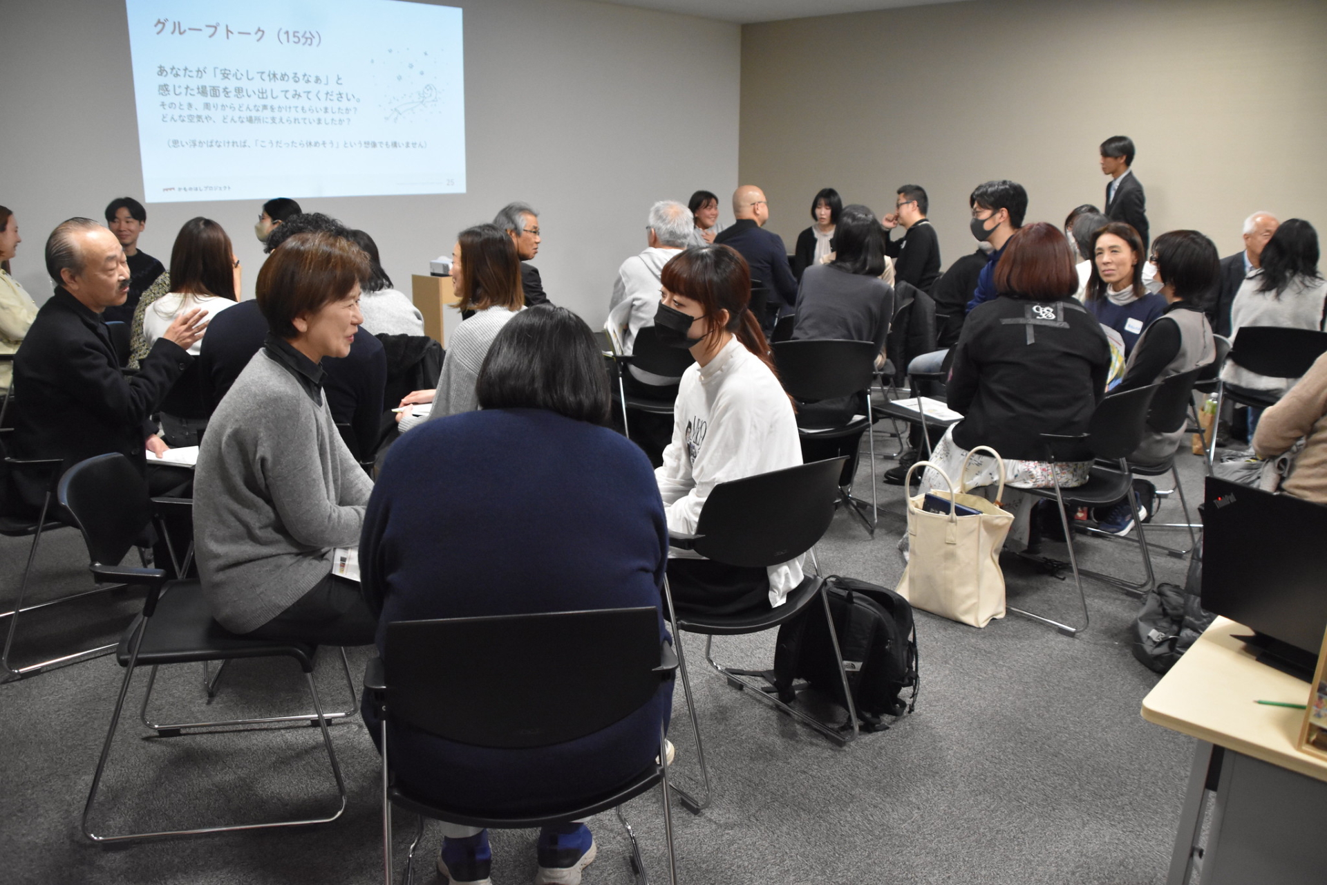 後半は、参加者全員でのグループトーク。テーマは、「あなたが「安心して休めるなぁ」と感じた場面を思い出してみてください」でした。