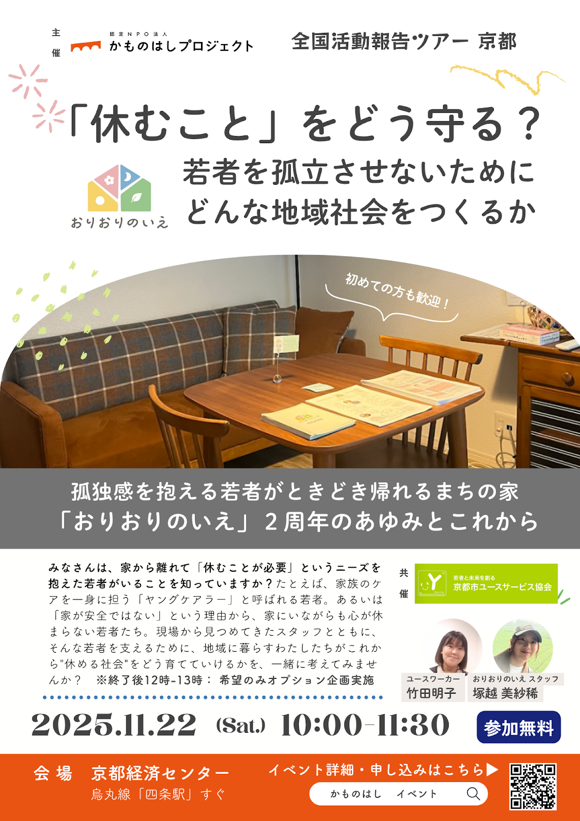 今回は、京都市ユースサービス協会さんと共に、若者のための ユースショートステイ「おりおりのいえ」2周年を記念したイベントを開催しました。同協会では、中学生から30代の若者が安心して過ごせる場づくりや子ども若者向けの相談事業などに取り組んでいます。