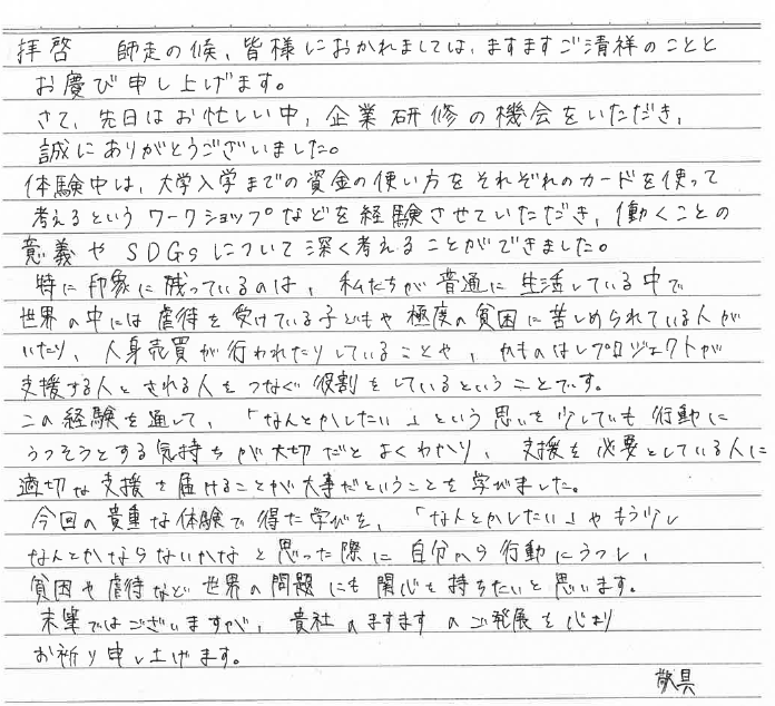 「『なんとかしたい』と思ったときに自分から行動にうつし、貧困や虐待など世界の問題にも関心を持ちたい」という言葉があり、胸が熱くなりました。